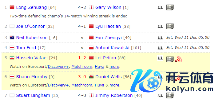 另外,邢子豪因为7届世锦赛冠军“火箭”罗尼-奥沙利文的退赛,不战自动晋级。无缘晋级的是吕昊天,他以1-4输给乔-奥康纳。随后凌晨场,上赛季最好少壮国强以1-4不敌“小钢炮”马克-艾伦。另一场焦点比赛中,世锦赛冠军“大鲨鱼”斯图尔特-宾汉以4-0零封吉米-罗伯逊。