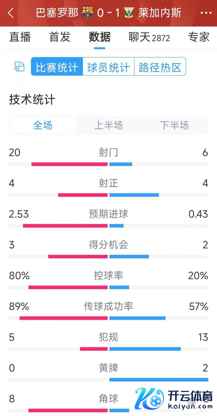 以下为两边全场数据对比:巴萨vs莱加内斯射门:20-6射正:4-4预期进球:2.53-0.43得分契机:3-2控球率:80%-20%传球见着力:89%-57%犯规:5-13黄牌:0-2角球:8-2体育赛事直播